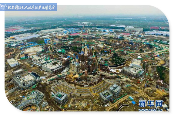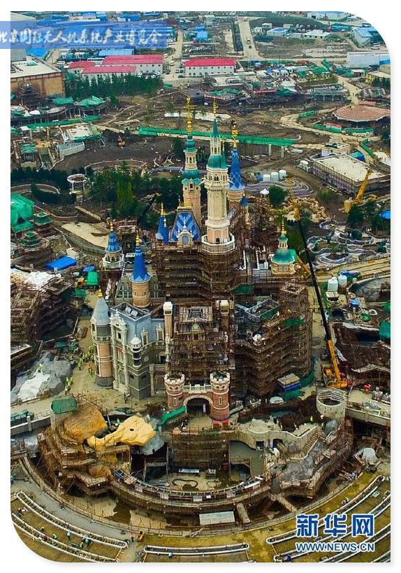 10月9日,摄影师航拍初具规模的上海迪士尼乐园最高标志性建筑——奇幻童话城堡。