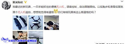 聚美优品的CEO陈欧为自己代言被大家熟知以后,一直以“霸道总裁”的眼光形象出现在大家的视线中,近期,陈欧在微博上晒出自己的新玩物无人机,并写道:“我最近的新玩具,一只手能抓住的便携无人机,语音控制,自动跟随跟拍。以后跑步和滑雪后面就跟个无人机追拍,想想就觉得有逼格,你们有啥玩具有这么高逼格的吗?”可见无人机已经成为明星大咖们口中的“高逼格”玩物了。
