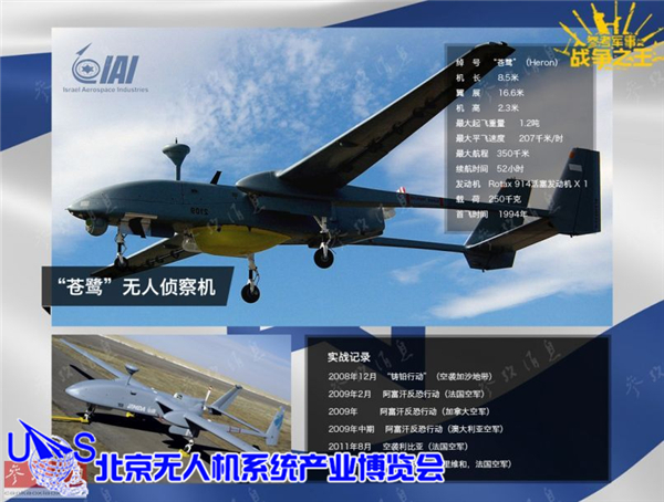 图为部署在阿富汗巴格拉姆空军基地的法国空军“雪鸮”(Harfang)无人侦察机,该机实际是基于以色列“苍鹭”I型无人机改进而来。从2009年2月开始,该型机在阿富汗主要负责支援法军的维和行动。