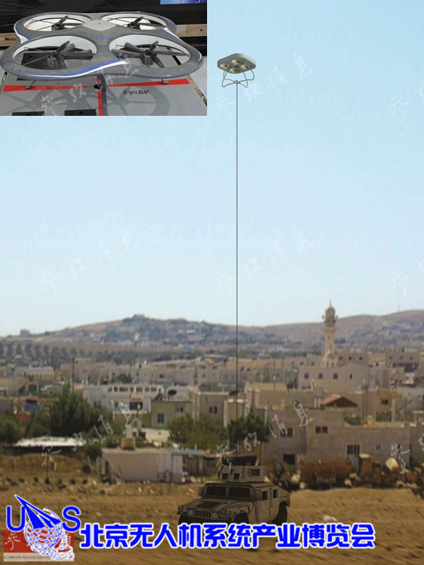 除单兵无人机外,IAI还于2012年推出了名为“电动系绳观测平台”( ETOP)的系留式四旋翼无人机,由于电源可通过地面的细电绳供电,续航时间近似于无限,其最大飞行高度3000米,可携带20千克载荷,十分适用于执行基地守卫或边境监视任务。