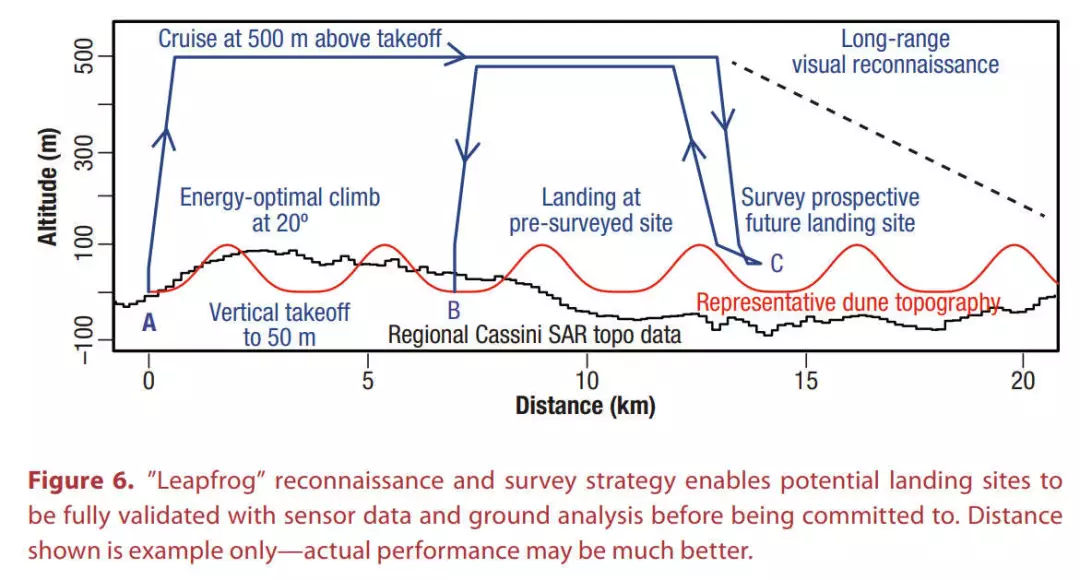 以这种方式则不需要对尚未对安全进行评估的着陆地点作出承诺。这种保守方法虽然花费了更长的时间来实现给定的多跳横向范围,但它将允许 Dragonfly 考虑更粗糙的地形,这些地形可能与更有吸引力的科学目标相关联,例如低温火山特征或冲击熔融片材,其中液态水可能与钛上的有机物相互作用。