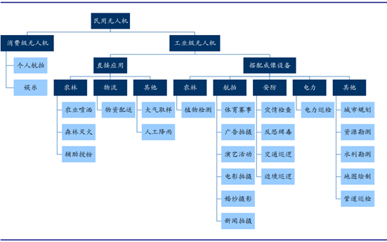 目前,民用无人机包含消费级无人机和工业级无人机。消费级无人机主要应用在航拍领域;工业无人机在电力、物流、农业、林业及安防等领域,大多数可以融入计算机的分析计算和人的 感知,辅助人们更为直观和高效地洞悉大数据背后的信息,成为大数据的采集器,应用范围不断扩大。
