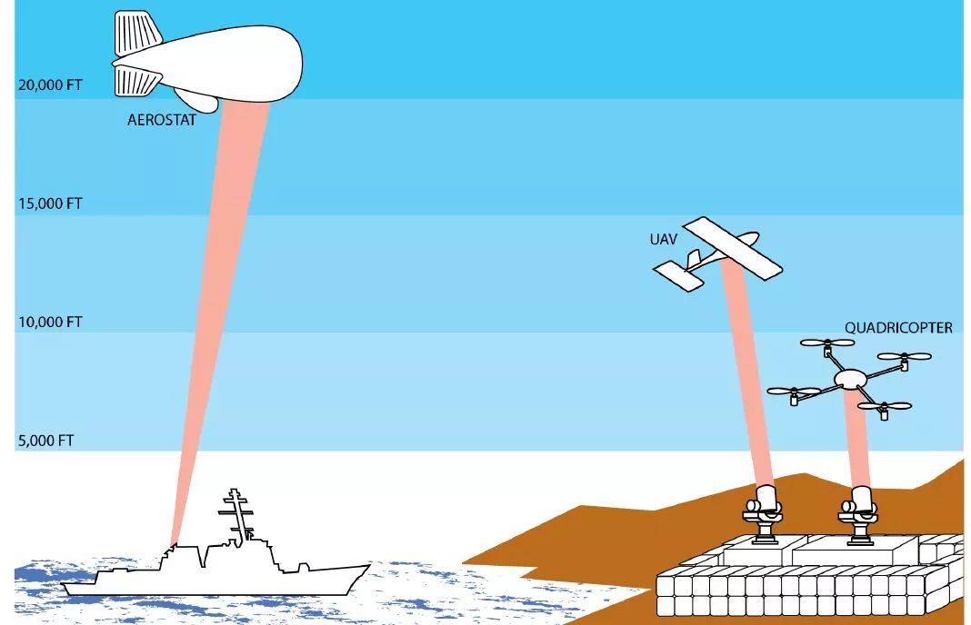 ▲美军对未来激光充能技术的设想,既可以通过地基激光充能系统为飞行高度在4572米以下的无人机充能,也可以通过战舰搭载的充能系统为在6096米以上高空飞行的监视飞艇充能。