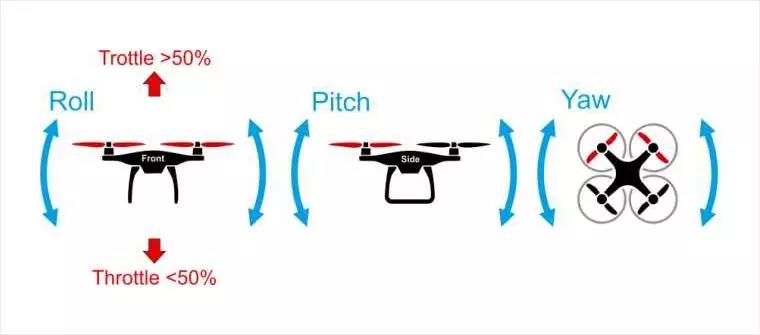 Roll,Pitch 和 Yaw 的移动都由飞手通过对控制器上的 4 个油门进行操作而完成。每种移动的快慢都可以通过改变对相应的油门大小来完成。图例如下,红色代表机头方向: