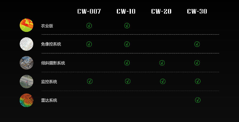 至此,纵横大鹏系列产品已经包括CW-007、CW-10、 CW-20、 CW-30、 CW-100五款垂起无人机平台,及基于平台搭载不同任务设备的集成系统。