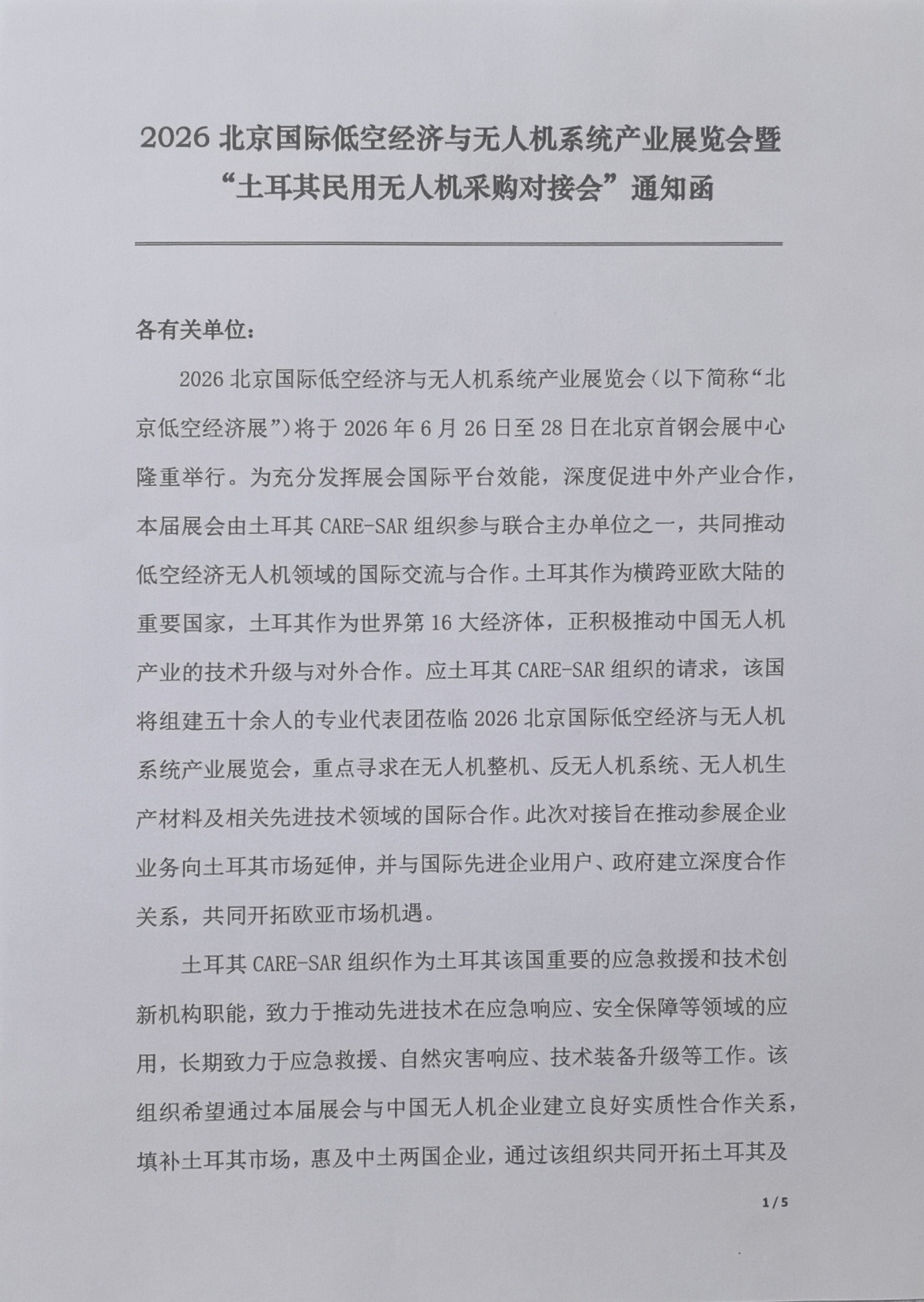 2026 北京国际低空经济与无人机系统产业展览会(以下简称“北京低空经济展UAS EXPO CHINA2026”)将于2026 年 6 月 26 日至 28 日在北京首钢会展中心隆重举行。为充分发挥展会国际平台效能,深度促进中外产业合作,本届展会由土耳其 CARE-SAR 组织参与联合主办单位之一,共同推动 低空经济无人机领域的国际交流与合作。土耳其作为横跨亚欧大陆的 重要国家,土耳其作为世界第 16 大经济体,正积极推动中国无人机产业的技术升级与对外合作。应土耳其 CARE-SAR 组织的请求,该国 将组建五十余人的专业代表团莅临 2026北京国际低空经济与无人机 系统产业展览会,重点寻求在无人机整机、反无人机系统、无人机生产材料及相关先进技术领域的国际合作。此次对接旨在推动参展企业 业务向土耳其市场延伸,并与国际先进企业用户、政府建立深度合作关系,共同开拓欧亚市场机遇。
