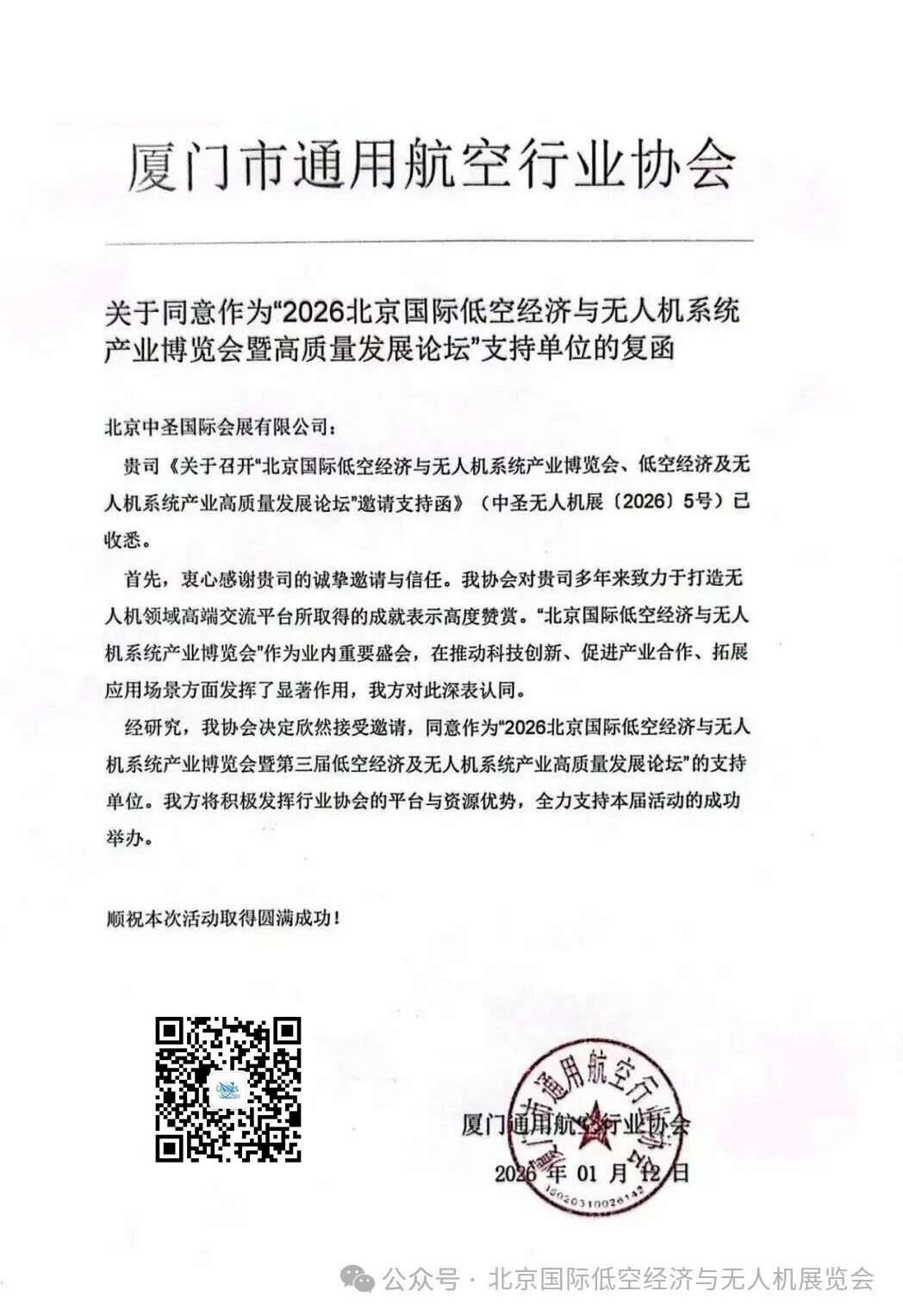 厦门市通用航空行业协会关于同意作为"2026北京国际低空经济与无人机系统产业博览会暨高质量发展论坛"支持单位的复函