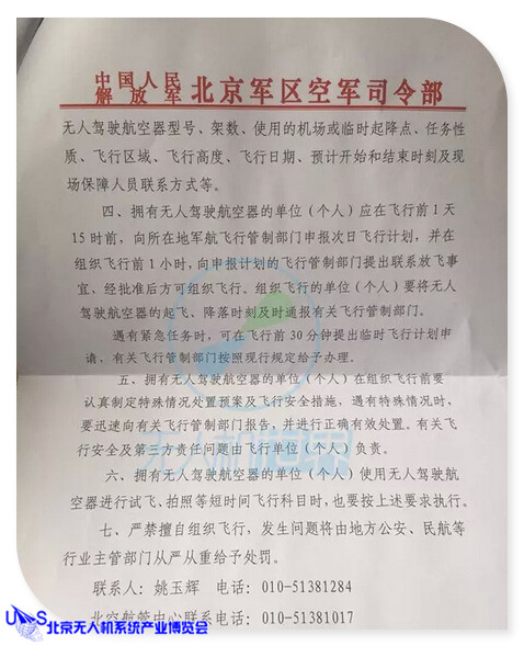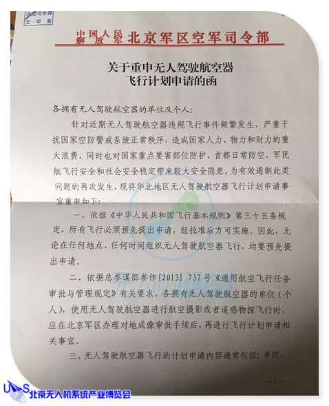 北京军区空军司令部《关于重申无人驾驶航空器飞行计划申请的函》表示,近期无人机驾驶航空器违规飞行事件频繁发生,严重干扰国家空防警戒系统正常秩序,造成国家人力、物力和财力的重大浪费,也对国家重点要害部位防护、首都日常防空、军民航飞行安全和社会安全稳定带来较大安全隐患,因此重申华北地区无人驾驶航空器飞行计划申请事宜。