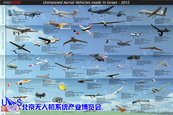 自20世纪70年代之后,以色列的无人机产业逐渐成为了以色列军工出口的几大支柱产业之一,图中列举了截至2012年,以色列研发的各类无人机,至少30多种型号,种类从微型无人机、中型无人机,再到大型高空长航时无人机以及无人直升机等应有尽有。