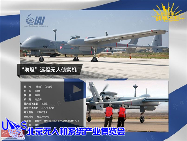 除”苍鹭“外, “埃坦”无人机(又称“苍鹭”TP)是IAI于2004年推出的高空长航时无人机,其26米的翼展与波音737客机相当,是以色列空军现役最大的无人机,从右小图中,和地勤人员的对比也能看出其尺寸之大。