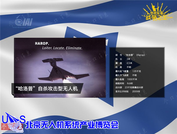与”哈比“相比,IAI于2009年公开的“哈洛普”反辐射无人机,提高了对采用“突然关机”对抗方式雷达的攻击能力,并且增加了“人在回路”的攻击监督方式,在控制员的操纵下,该机可以中途改变打击目标,或在攻击时改变航线,具有更高的作战灵活性。目前印度和土耳其已购买了该型无人机。图中三个词分别代表:巡飞、定位,摧毁。