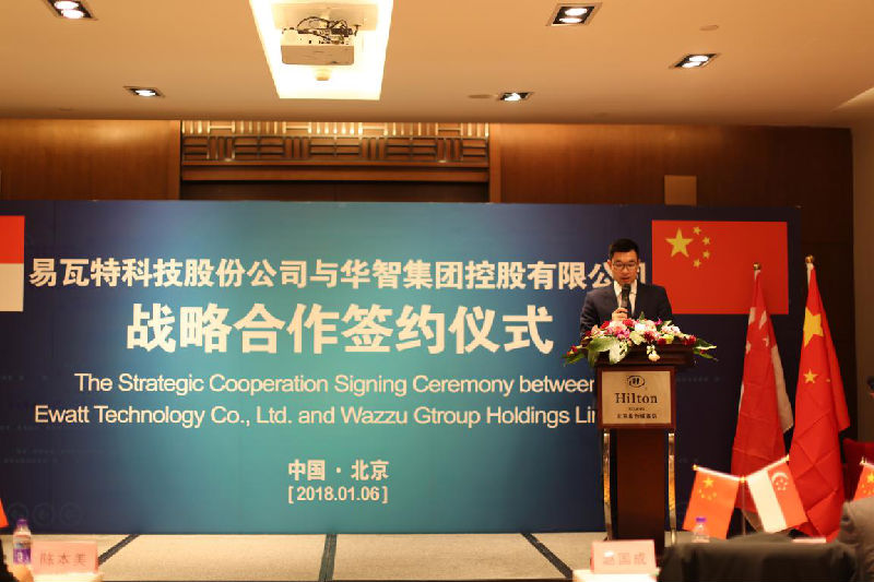2018年1月6日,易瓦特与华智集团在京签订战略合作协议,并聘请新加坡国立大学教务长首席教授陈本美为易瓦特首席技术顾问。易瓦特董事长赵国成表示,本次协议的签署将对促进易瓦特无人机新产品研发和创新科技成果转化,提供智力支持和技术支撑,具有里程碑的意义。