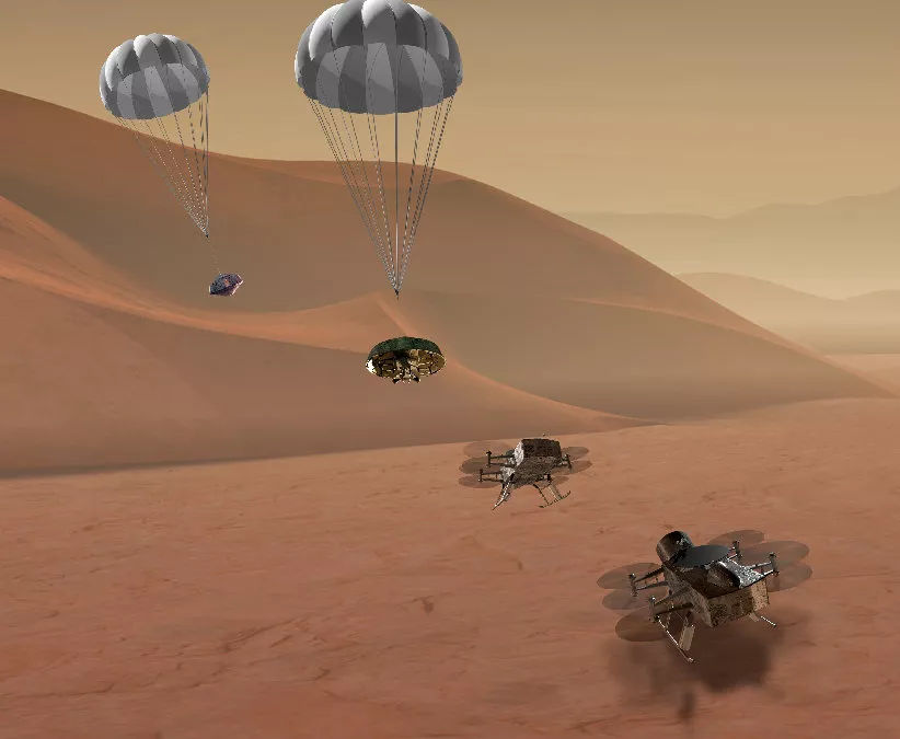 虽然在地面上进行科学研究是有价值和安全的,但 Dragonfly 的重点就是它能飞。一个小时内它比火星上的漫步者在 10 年内走的路还长,还不用担心障碍。在为期一两年的任务期间,Dragonfly 能详细地探索泰坦表面的巨大数量,进行探索。它不会从轨道上降落,而是从降落伞空壳里掉出来,然后飞下来,在选择最安全的地方进行第一次着陆之前,能扫描数公里的地形。最初的着陆区域很可能是大沙丘地带,在雷达图像的基础上,沙丘之间的平坦区域很平坦。从那时起,蜻蜓就可以从上面飞着侦察地形,但真正令人兴奋的是,当它开始在新的地方探索更远的地方。