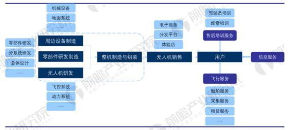 无人机属于高科技产品,拥有者较为复杂的产业链。按照上下游可以分为产品研发制造试验、飞控系统、动力系统、周边设备的研发制造、整机组装、产品销售及产品服务等环节。