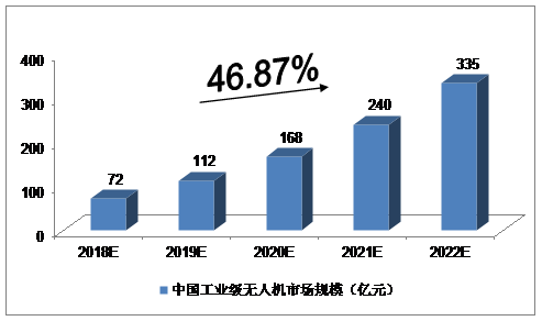 综合以上因素,我们预计,2018年中国工业级无人机市场规模将达到72亿元,未来五年(2018-2022)年均复合增长率约为46.87%,2022年中国工业级无人机市场规模将达到335亿元。