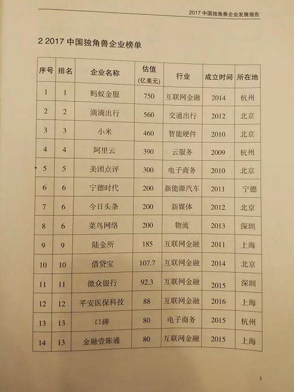 “2017年中国独角兽企业榜单”