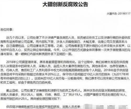 公告中称,2018年,由于供应链腐败,造成大疆的平均采购价格超过合理水平20%以上,其中高价物料少则高出20%-50%,低价物料不少以市场合理水平2-3倍的价格向大疆出售。除此之外,还有不少腐败手段。
