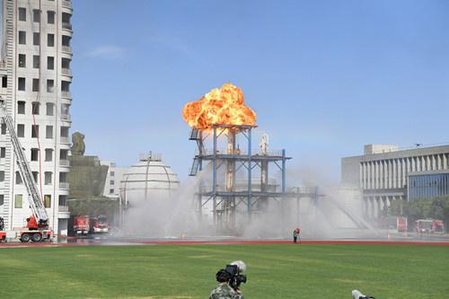 伴随巨大的爆炸声,化工生产装置遭敌严重“破坏”,一反应釜进料管道断裂,大量物料泄漏,发生燃烧,火焰瞬间吞噬了整个装置,并向后侧油料储罐逼近。