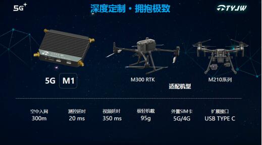 2021年1月,天宇经纬正式发布大疆M300 RTK无人机专用5G机载终端——天宇云盒M1,打破长期困扰大疆用户的图传距离和地形遮挡限制,有力补充了遥控器链路,实现大疆无人机空中入网,实时视频传输,远程电脑操控,极大发挥出新一代M300 RTK的长续航优势,在自动化巡检等行业领域具有广阔前景。