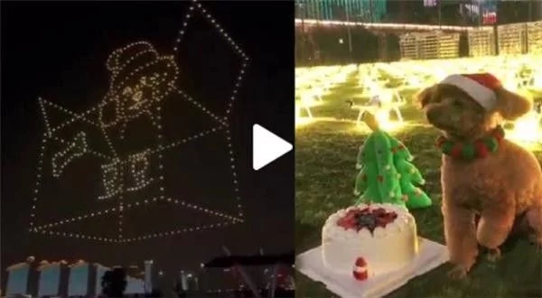 湖南长沙,福元路大桥旁的夜空中升起了几百架无人机,在夜幕中展现出盒子缓缓打开、露出一只戴圣诞帽的小狗等画面,还有“祝豆豆十岁生日快乐”的字样。