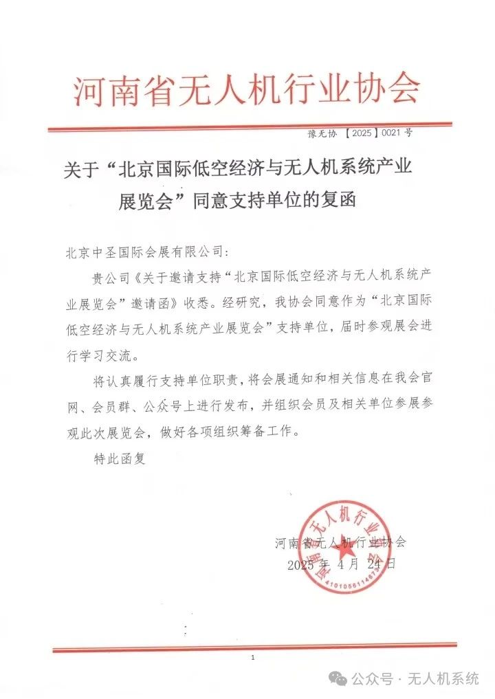 关于“北京国际低空经济与无人机系统产业展览会”同意支持单位的复函