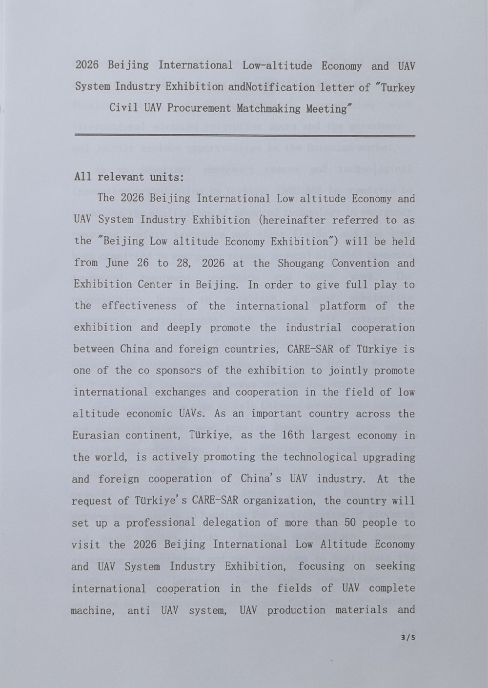 2026 北京国际低空经济与无人机系统产业展览会(以下简称“北京低空经济展UAS EXPO CHINA2026”)将于2026 年 6 月 26 日至 28 日在北京首钢会展中心隆重举行。为充分发挥展会国际平台效能,深度促进中外产业合作,本届展会由土耳其 CARE-SAR 组织参与联合主办单位之一,共同推动 低空经济无人机领域的国际交流与合作。土耳其作为横跨亚欧大陆的 重要国家,土耳其作为世界第 16 大经济体,正积极推动中国无人机产业的技术升级与对外合作。应土耳其 CARE-SAR 组织的请求,该国 将组建五十余人的专业代表团莅临 2026北京国际低空经济与无人机 系统产业展览会,重点寻求在无人机整机、反无人机系统、无人机生产材料及相关先进技术领域的国际合作。此次对接旨在推动参展企业 业务向土耳其市场延伸,并与国际先进企业用户、政府建立深度合作关系,共同开拓欧亚市场机遇。