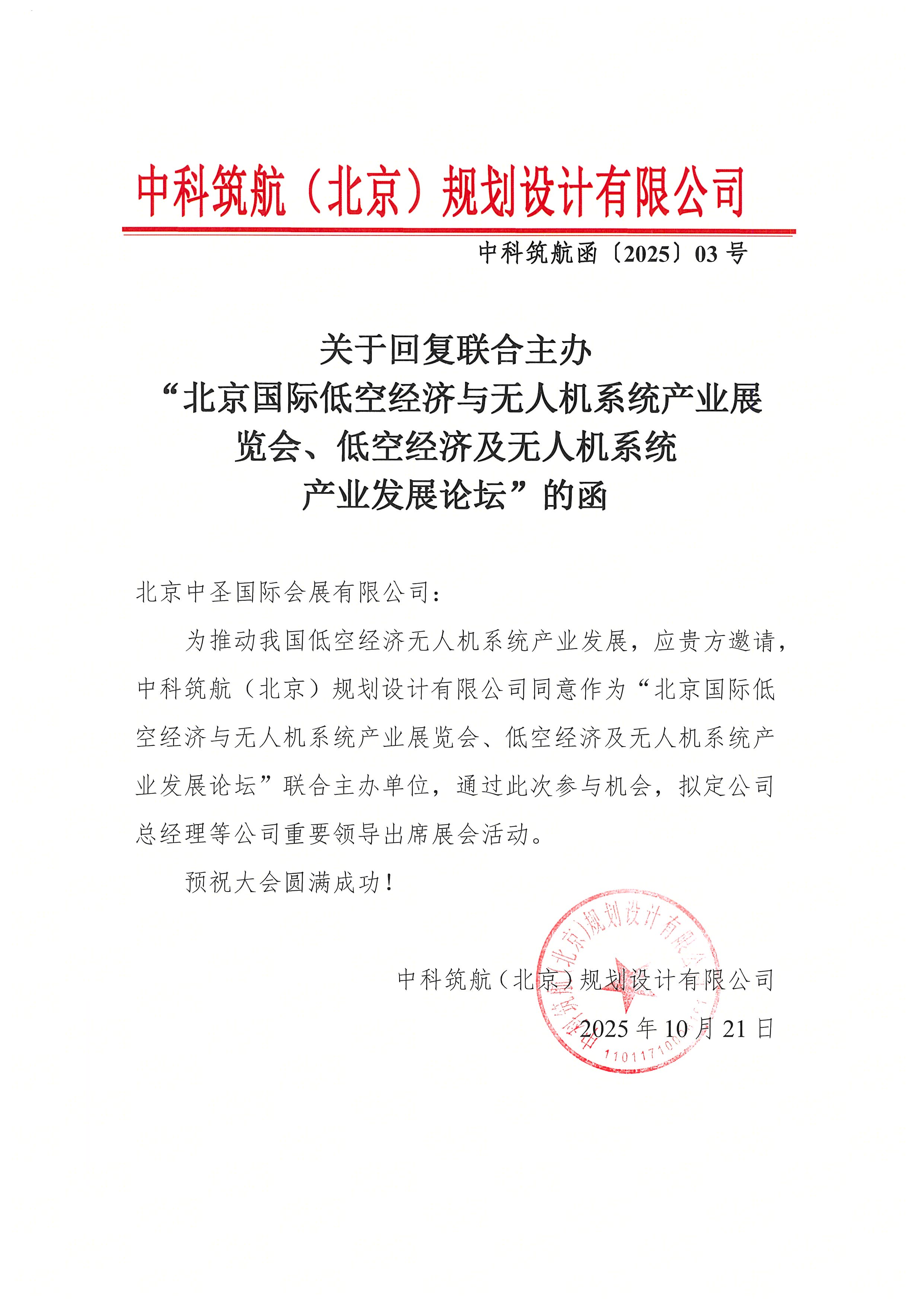 中科筑航(北京)规划设计有限公司关于回复联合主办“北京国际低空经济与无人机系统产业展览会、低空经济及无人机系统产业发展论坛”的函,展会时间为2026年6月26日-28日在北京首钢国际会展中心隆重召开。