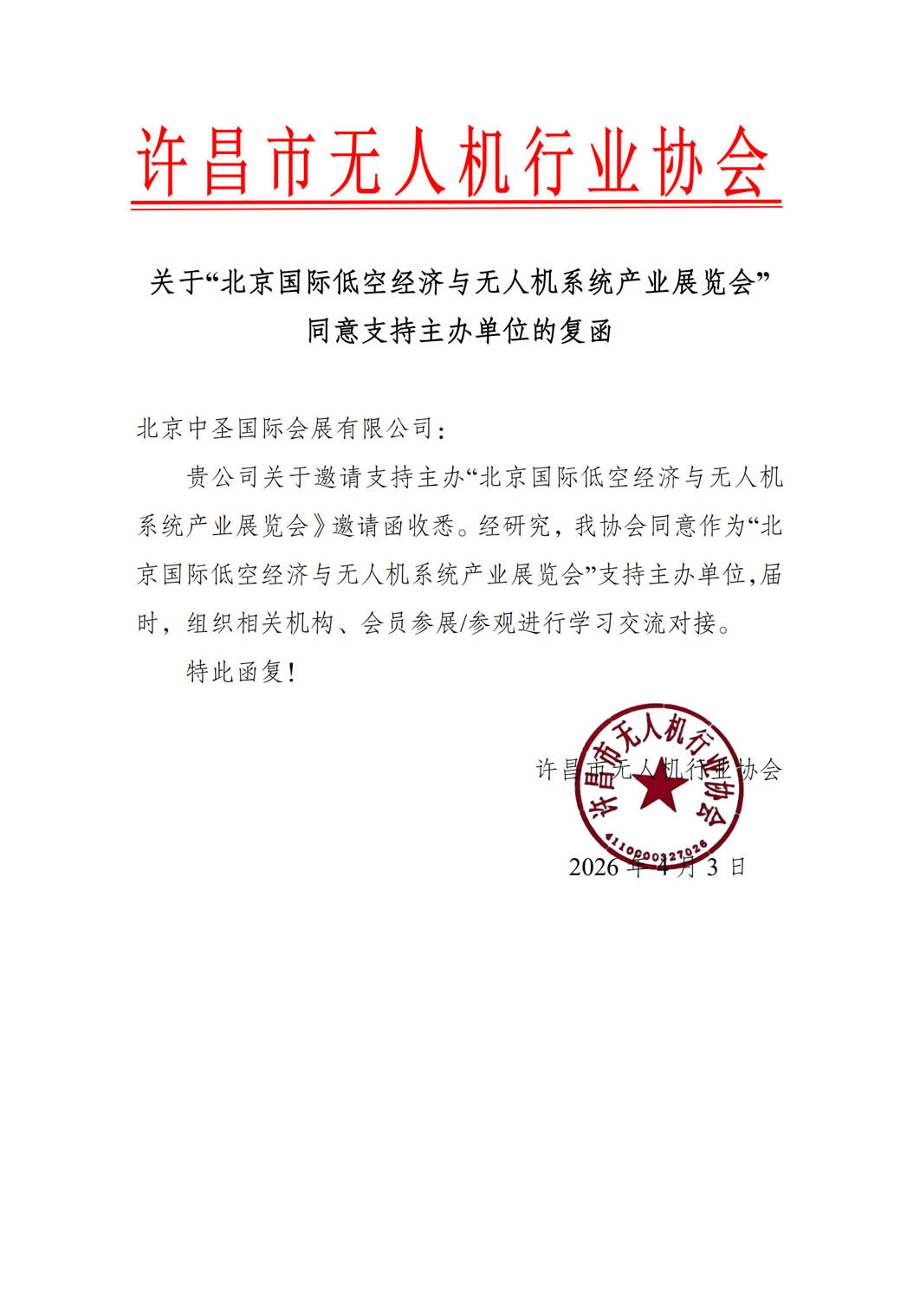 许昌市无人机行业协会关于“北京国际低空经济与无人机系统产业展览会”同意支持主办单位的复函